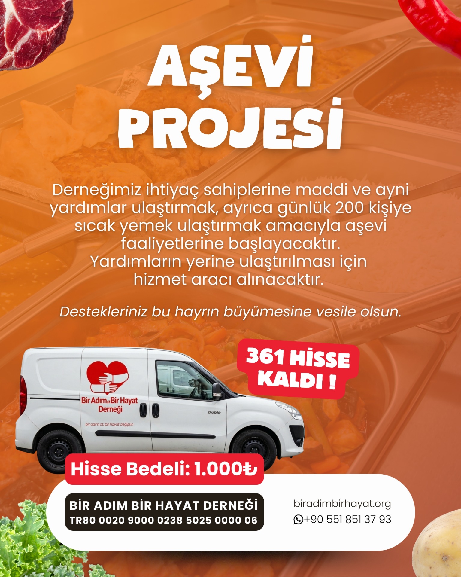 Aşevimiz; yalnızca yemek dağıtan bir yer değil, aynı zamanda paylaşmanın, kardeşliğin ve merhametin yaşandığı bir iyilik kapısıdır. Her gün hazırlanacak sıcak yemeklerle, ihtiyaç sahibi kardeşlerimize ulaşmayı hedefliyoruz; aslında sadece karınlar değil, gönüller de doyurulmaktadır.